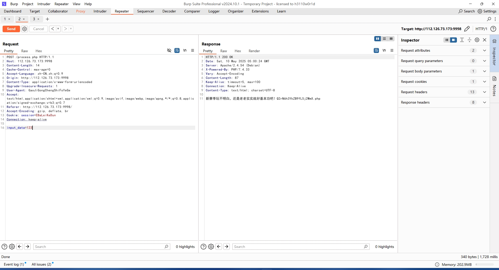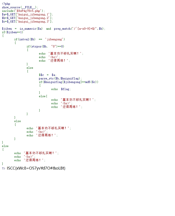 $jiben = is_numeric($a) and preg_match('/^[a-z0-9]+$/',$b); if($jiben==1) { if(intval($b) == 'jibengong') { if(strpos($b, "0")==0) { echo '基本功不够扎实啊!'; echo '<br>'; echo '还得再练!'; } else { $$c = $a; parse_str($b,$huiguiflag); if($huiguiflag[$jibengong]==md5($c)) { echo $flag; } else{ echo '基本功不够扎实啊!'; echo '<br>'; echo '还得再练!'; } } } else { echo '基本功不够扎实啊!'; echo '<br>'; echo '还得再练!'; } } else { echo '基本功不够扎实啊!'; echo '<br>'; echo '还得再练!'; } ?>